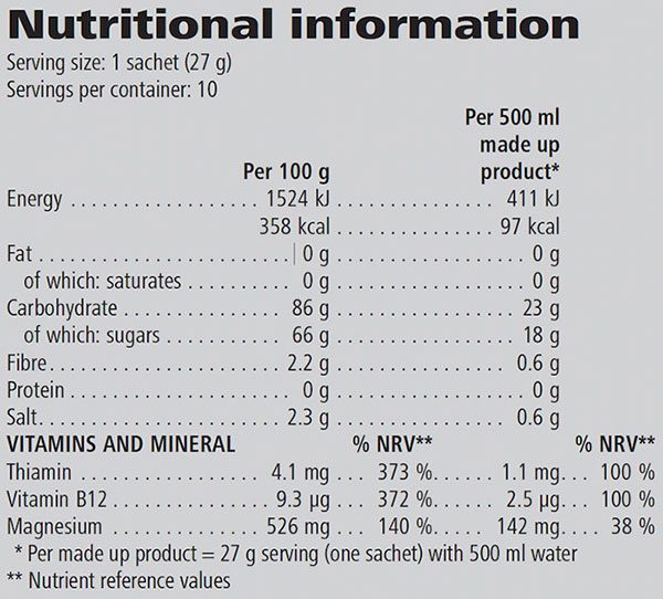 Mix 1 sachet (27 g) with 500 ml of water and shake vigorously. Best consumed during exercise.