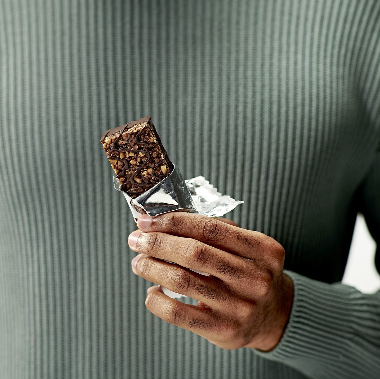 Soy crisps (24.2 %) (soy protein isolate, tapioca starch, salt), glucose syrup, couverture chocolate (12.5 %, cocoa solids minimum 56 %) (sugar, cocoa mass, cocoa butter, emulsifier (lecithins (soy))), Promitor® fibre, soy granules (10.4 %), fructose, minerals mixture (calcium carbonate, potassium phosphate, potassium chloride, magnesium oxide, ferric pyrophosphate, zinc oxide, sodium selenite, manganese sulphate, cupric gluconate, potassium iodide), humectant (glycerol), maltodextrin, cocoa mass, rice crisps (2.1 %) (rice flour, rice syrup powder), chocolate chips (1.8 %, cocoa solids: 48 % minimum) (sugar, cocoa mass, cocoa butter, emulsifier (lecithins (soy)), natural flavouring), fat reduced cocoa powder (cocoa butter: 10 % minimum), vegetable oils (fully refined sunflower and/or soy), flavourings, sodium chloride, vitamins mixture (Vitamin C (L-ascorbic acid), Vitamin E (DL-alpha-tocopheryl acetate), Niacin (nicotinamide), Vitamin A (retinyl acetate), Pantothenic acid (calcium D-pantothenate), Biotin (D-biotin), Vitamin B12 (cyanocobalamin), Vitamin D (cholecalciferol), Vitamin B6 (pyridoxine hydrochloride), thiamin (thiamin mononitrate), Vitamin K (phylloquinone), riboflavin, folic acid (pteroylmonoglutamic acid)), natural flavouring and acidity regulator (citric acid).