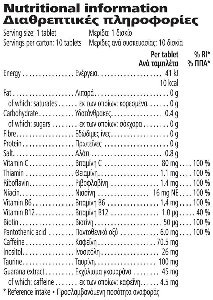 Acid (citric acid), acidity regulator (sodium bicarbonate), maltodextrin, flavourings, taurine, L-ascorbic acid, caffeine powder, sweeteners (acesulfame-K, sucralose), guarana extract, inositol, nicotinamide, bulking agent (sorbitol), calcium D-pantothenate, sodium riboflavin 5’-phosphate, pyridoxine hydrochloride, thiamin mononitrate, D-biotin and cyanocobalamin.