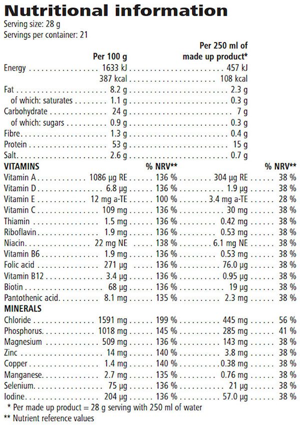 Soya protein isolate (47 %), maltodextrin, calcium caseinate (milk), creamer (sunflower oil, maltodextrin, sodium caseinate (milk)), flavourings, magnesium phosphate, emulsifier (soya lecithin), sodium chloride, potassium chloride, thickeners (guar gum, xanthan gum), calcium phosphate, magnesium oxide, sweetener (sucralose), L‐ascorbic acid, beta-carotene, DL‐alpha‐tocopheryl acetate, nicotinamide, zinc oxide, calcium D‐pantothenate, manganese carbonate, anti‐caking agent (silicon dioxide), cyanocobalamin, cholecalciferol, pyridoxine hydrochloride, thiamin hydrochloride, riboflavin, cupric citrate, pteroylmonoglutamic acid, potassium iodide, sodium selenite and D‐biotin.
